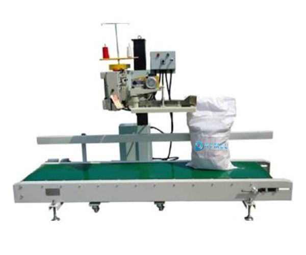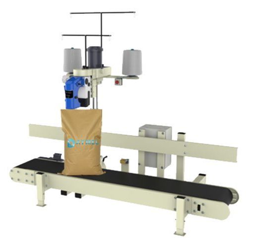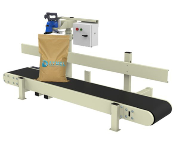 Pedestal mecánico con banda transportadora para cosedoras portátiles Marca New Long, Yaohan, Megatex, entre otras, la costura se acciona con un pedal el cual es más fácil de utilizar para agilizar el cerrado de sacos en la línea de envasado.